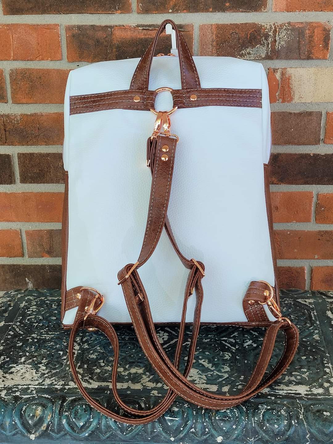 There are optional purse feet on the flat bottom. The spacious interior has a zipper pocket and twin slip pockets, both finished with exterior fabric trim. A dressed-up backpack for heading to the office or out for the day.